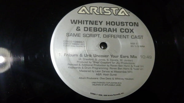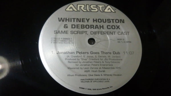 High energy remixes of Whitney Houston & Deborah Cox’s “Same Script, Different Cast”. Side A for Jonathan Peter’s high energy trance-y tribal house remix.